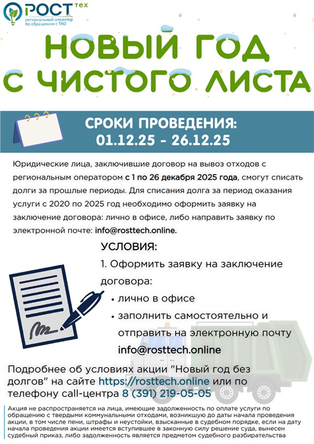 Юридические лица, заключившие договор на вывоз отходов с региональным оператором с 1 декабря по 26 декабря 2025 года, смогут списать долги за прошлые периоды (2020-2025 гг.) в рамках акции «Новый год с чистого листа»**. Оформить заявку на заключение договора можно онлайн, или лично в офисе.