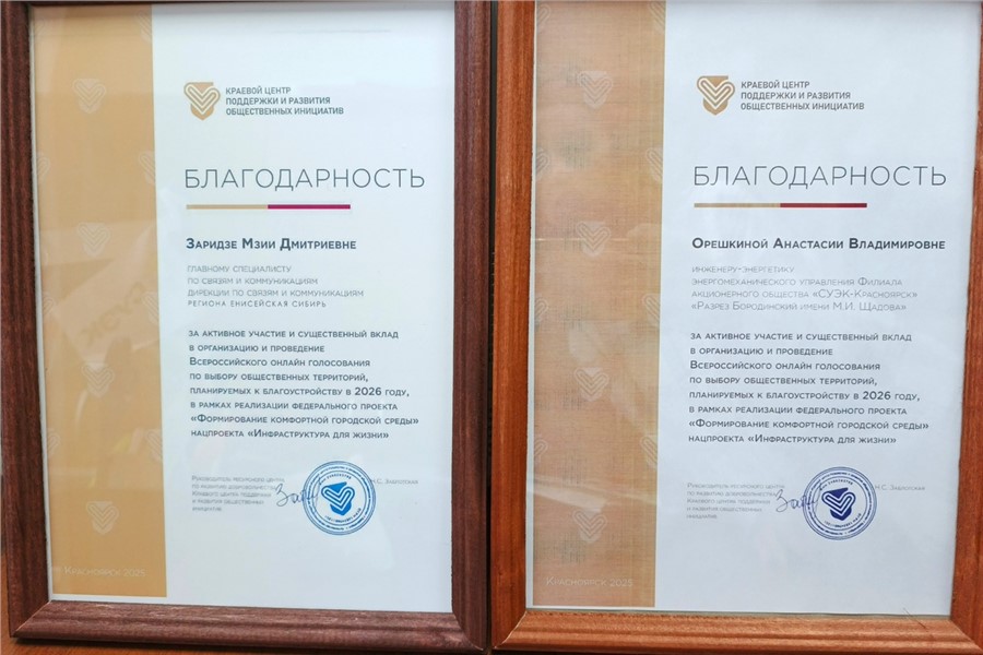 Активистов волонтерского движения Бородинского разреза — главного специалиста дирекции по связям и коммуникациям Мзию Заридзе и инженера-энергетика Анастасию Орешкину отметили благодарностями Краевого центра поддержки и развития общественных инициатив. Они получили заслуженное признание за активное участие и существенный вклад в организацию и проведение всероссийского онлайн голосования по выбору общественных территорий для благоустройства в 2026 году в рамках федерального проекта «Формирование комфортной городской среды» нацпроекта «Инфраструктура для жизни». В течение двух месяцев в свободное от работы время сотрудники Бородинского разреза помогали коллегам проголосовать на онлайн-платформе за одну из пяти территорий, заявленных в этом году на конкурс.