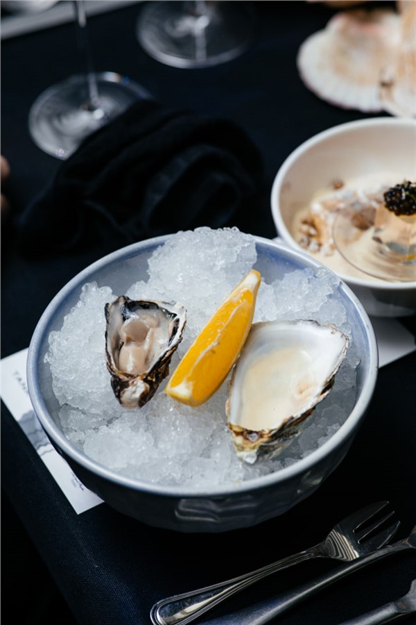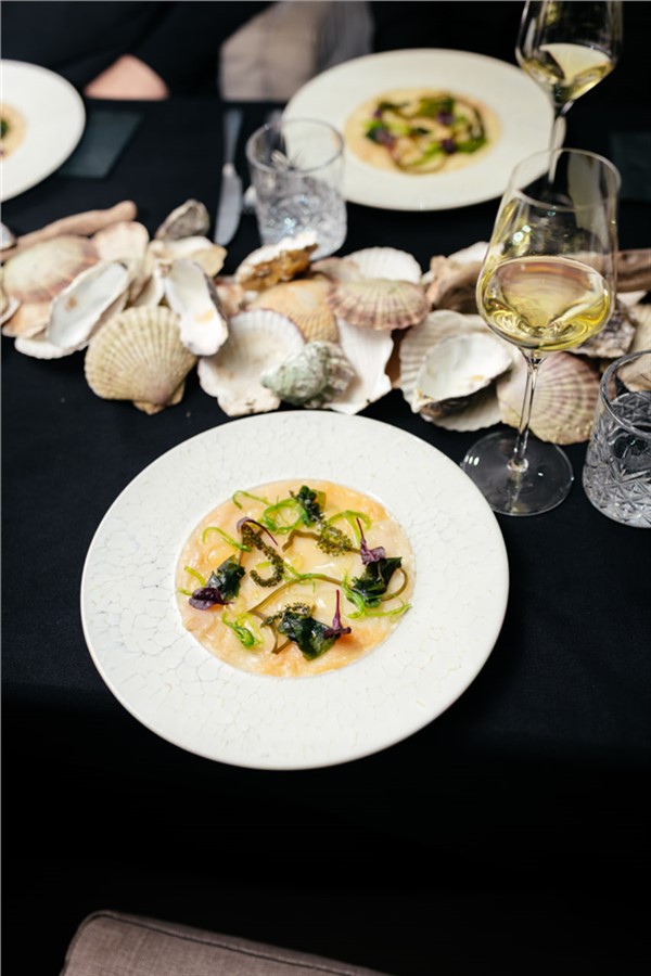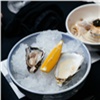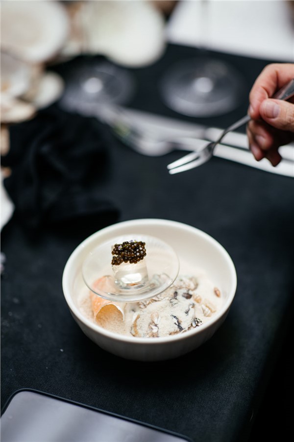 Курс сочетает коктейль и устрицу, объединяя морскую тему с легкой игристой нотой.