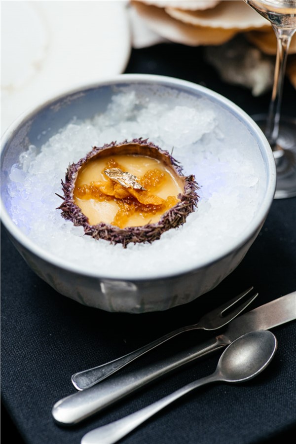 Освежающий курс, призванный перезагрузить рецепторы после насыщенных морских вкусов. Сорбет из маракуйи (passion fruit) наполняет морского ежа и дополняется икрой из соуса понзу.