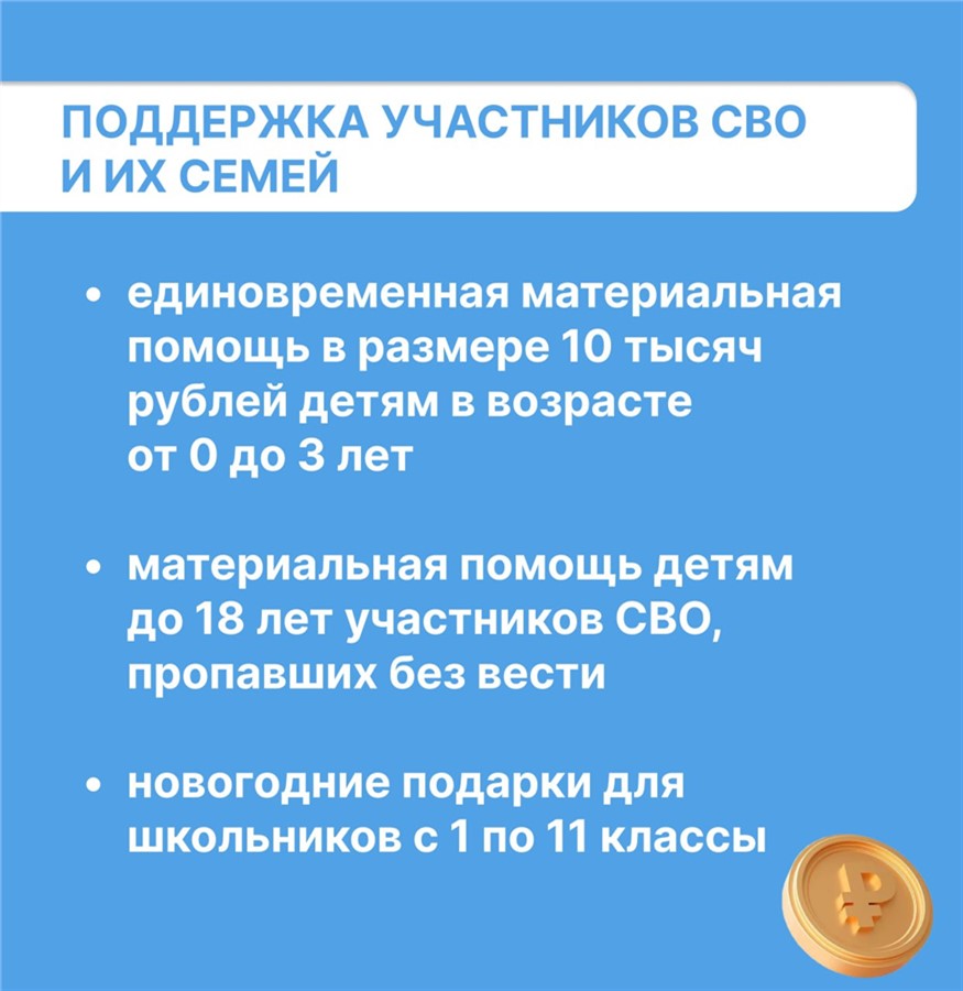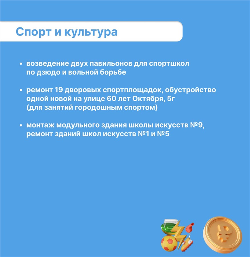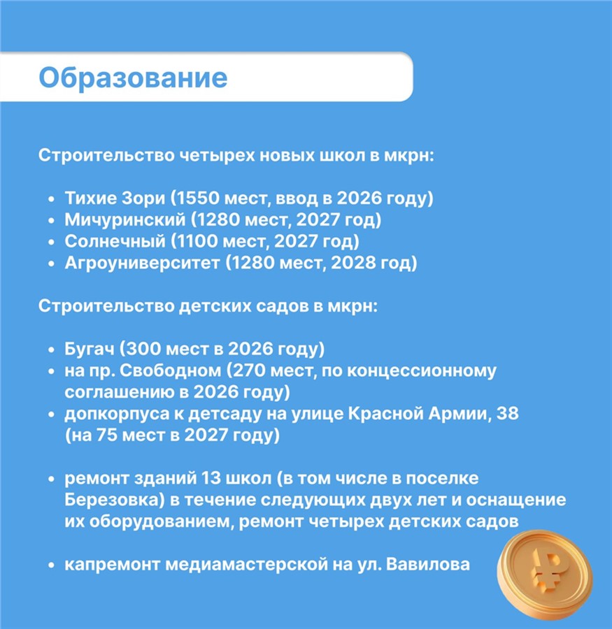 Наибольшая доля расходов (64 %) традиционно приходится на социальную сферу, включая образование, культуру и спорт, работу с молодежью и поддержку участников СВО. В бюджете учтены текущие потребности и развитие инфраструктуры присоединенных территорий.