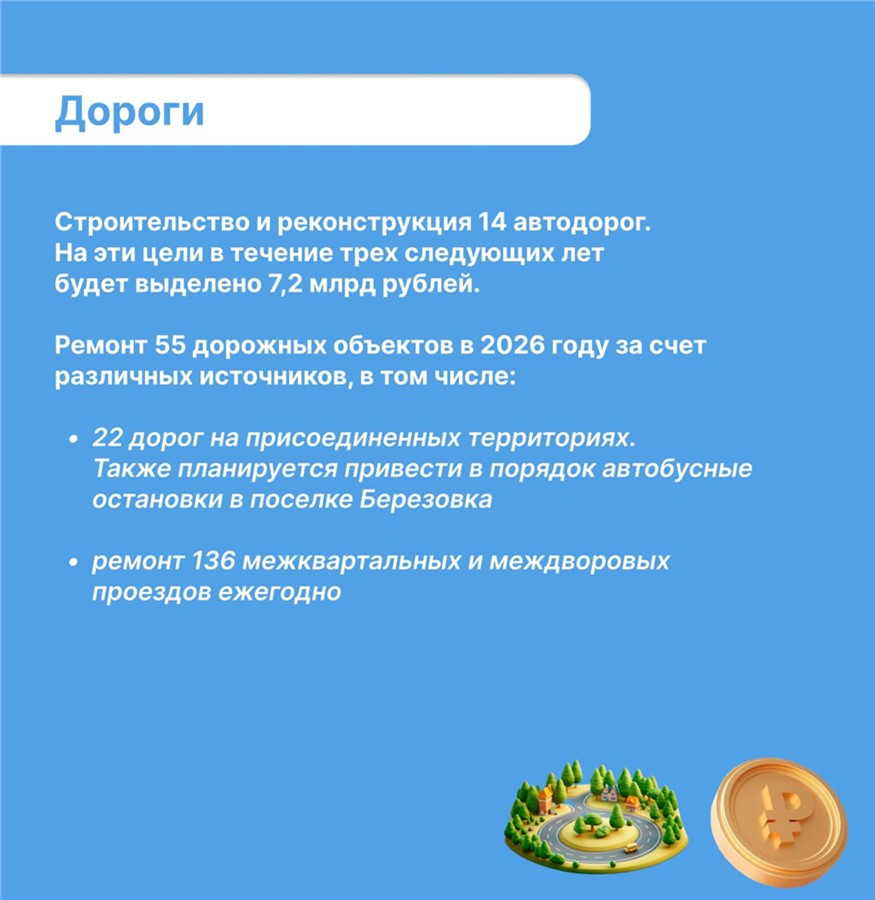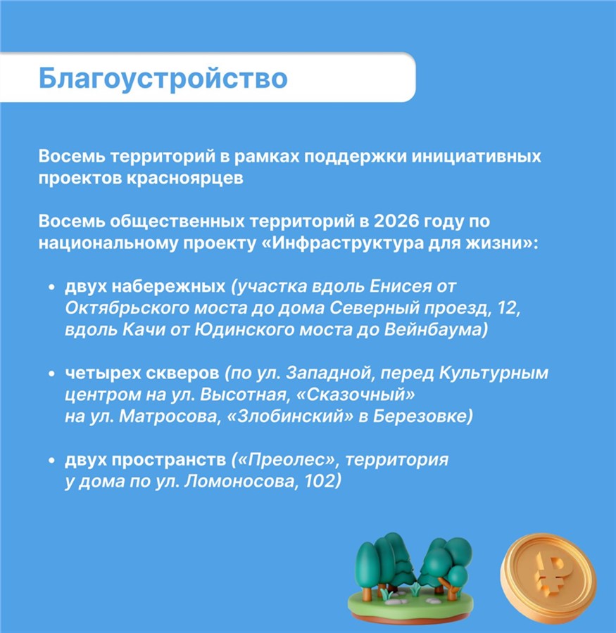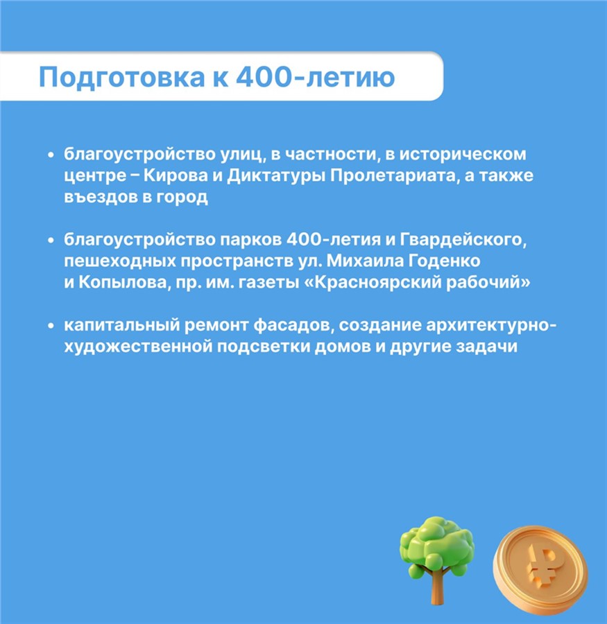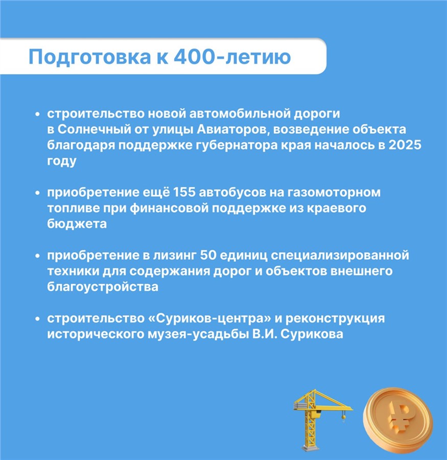 При этом отдельный вектор связан с подготовкой Красноярска к 400-летию. На данные мероприятия в течение трех лет будет направлено 25,9 млрд рублей. За счет этого в городе появятся новые объекты транспортной инфраструктуры, культурной сферы, будет проведено благоустройство знаковых парков, площадей и пешеходных пространств, обновлен общественный транспорт.