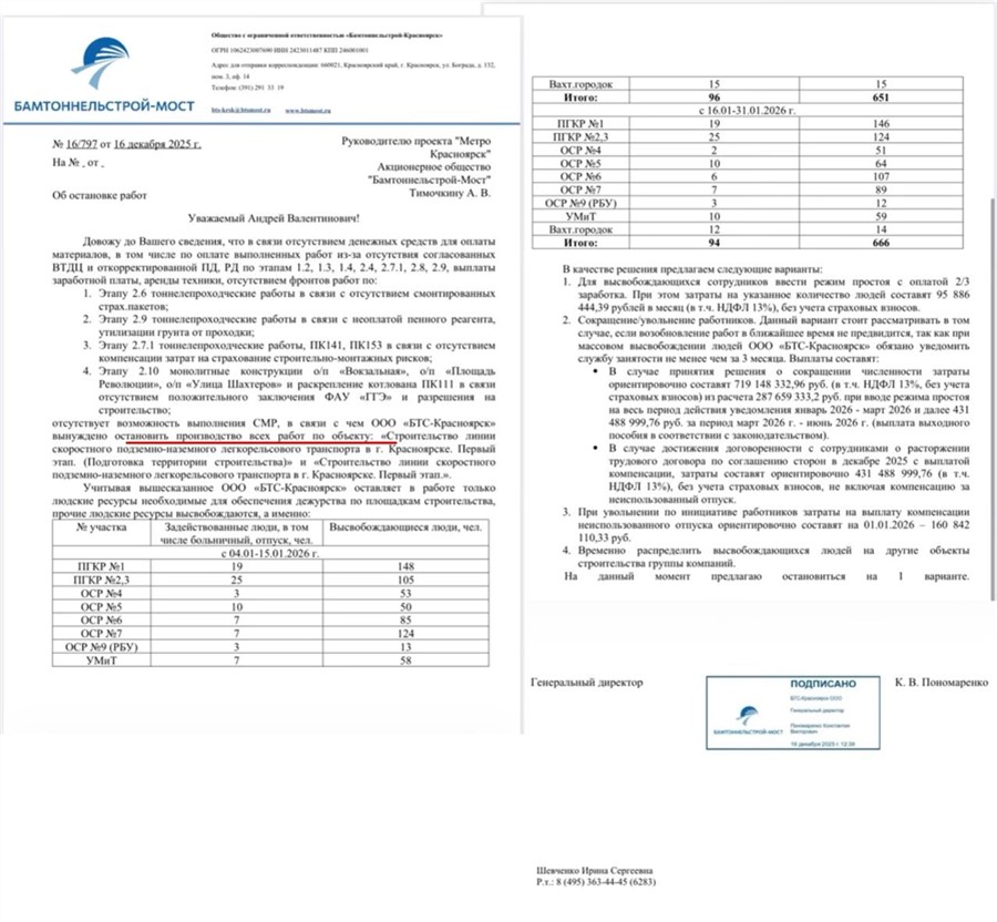 Информация о возможной остановке производства всех работ по объекту из-за отсутствия денег для оплаты материалов и уже выполненных обязательств появилась накануне в местных СМИ и Телеграм-каналах со ссылкой на якобы письмо руководства «Бамтоннельстрой-Красноярск» в головную компанию — «Бамтоннельстрой-мост».