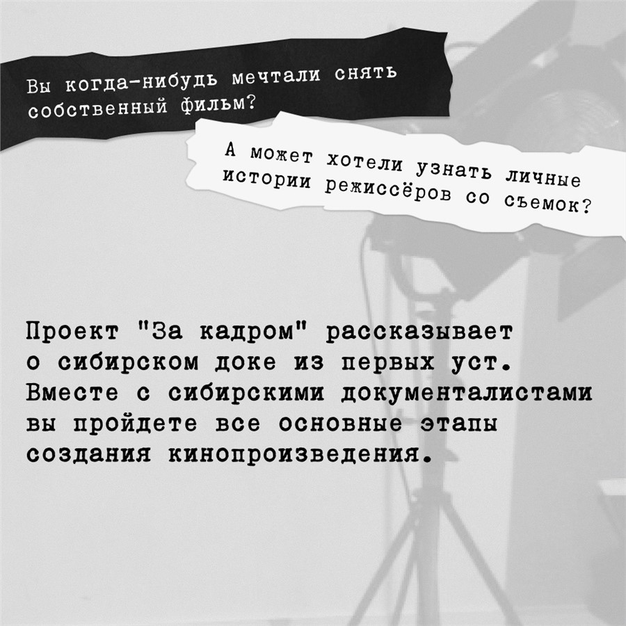 Учащиеся четвертого курса отделения журналистики Сибирского федерального университета в рамках дисциплины «Продюсирование цифровых медиапроектов» запустили мультимедийный проект «За кадром». Он посвящен документальному кино и его сибирским особенностям.