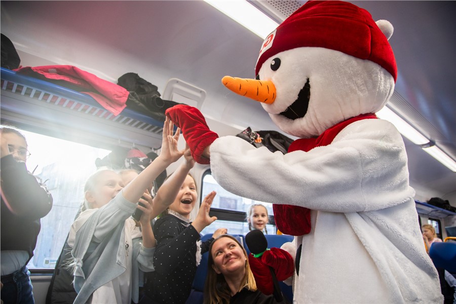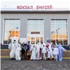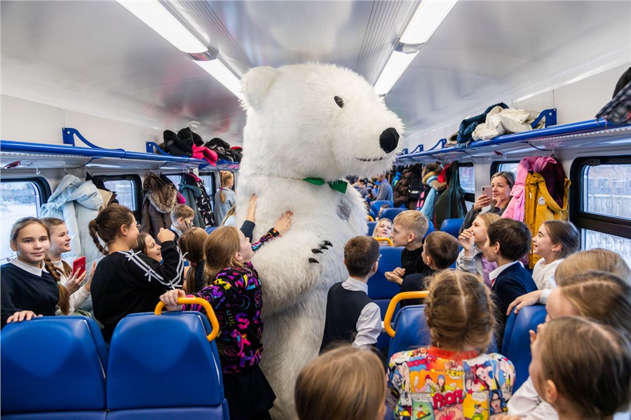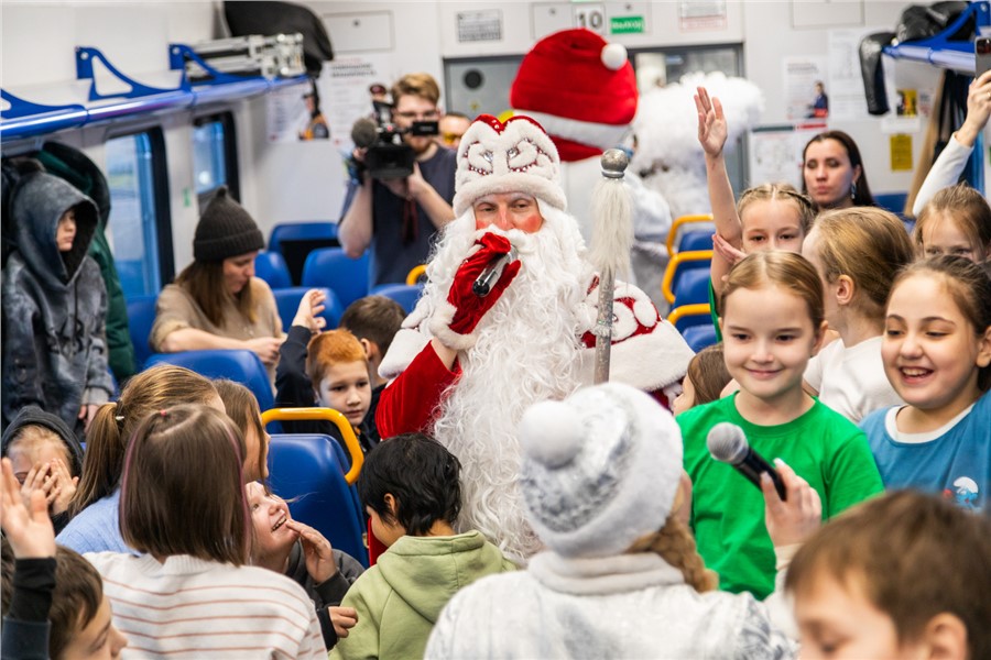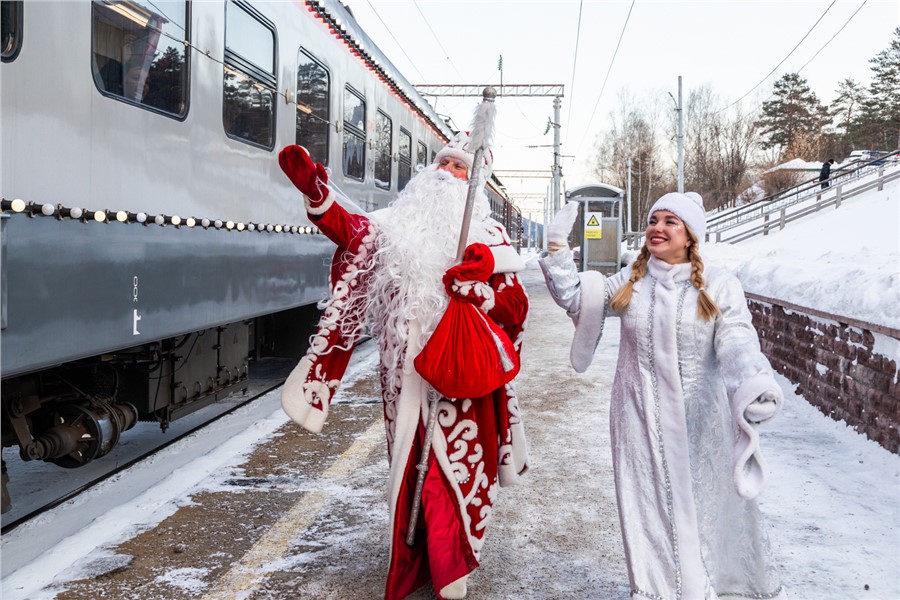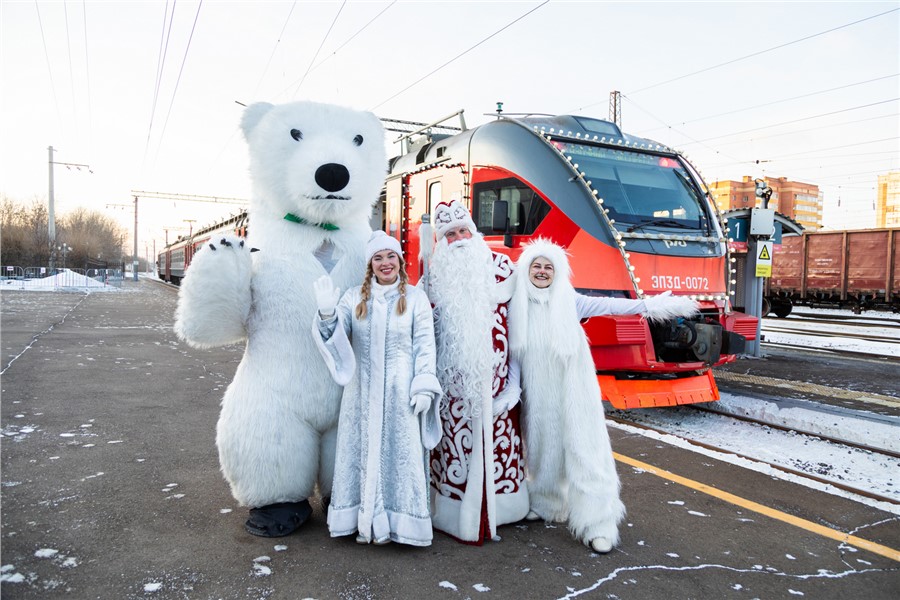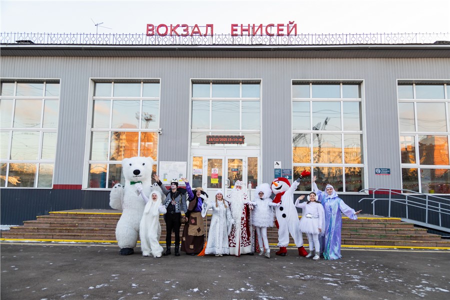 Приключения юных путешественников начались на станции Енисей в Красноярске. Здесь во время остановки поезда в вагоны вошли герои знаменитых зимних сказок.
