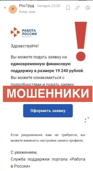 «Будьте внимательны и осторожны. Некоторые красноярцы получили такие письма якобы от сайта „Работа России“. Их рассылают мошенники. Пожалуйста, не проходите по ссылке. Служба занятости не предлагает получить какие-то выплаты просто так. Все меры государственной поддержки назначаются индивидуально гражданам!», — предупредил жителей депутат ЗС Илья Зайцев.
