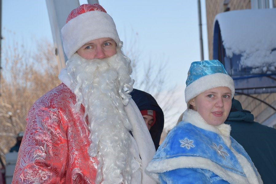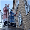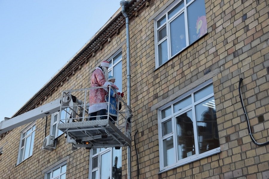 Участники акции украсили елку во дворе больницы, а Дед Мороз и Снегурочка с помощью пожарного автоподъемника поднялись к окнам палат.