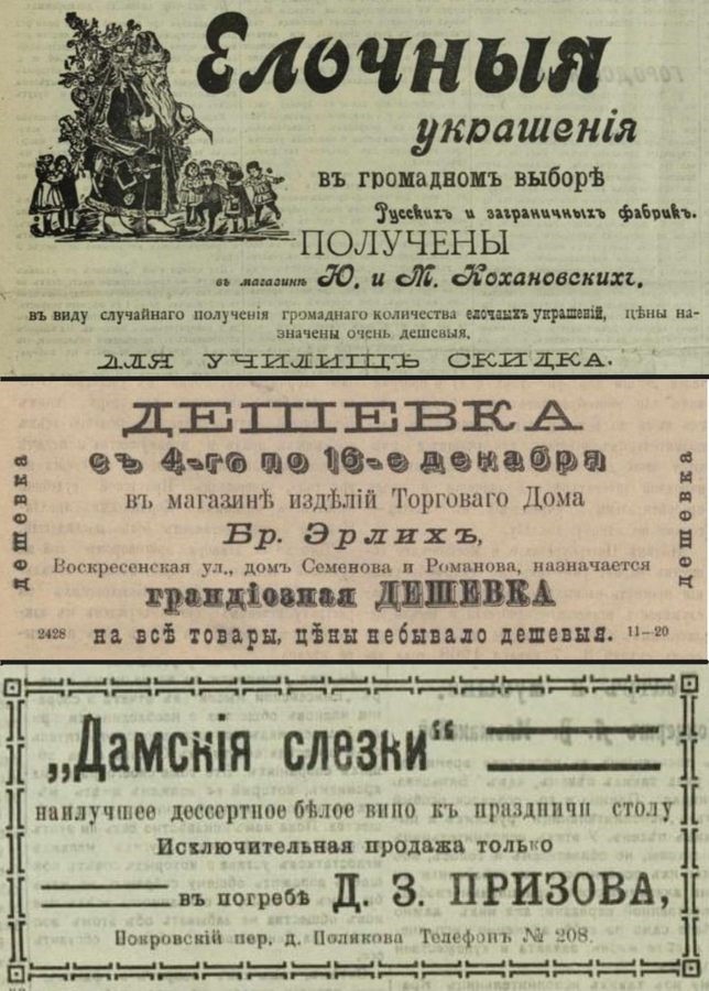 Красноярский краевой краеведческий музей собрал архивную подборку предновогодних рекламных объявлений из газет Енисейской губернии начала XX века.