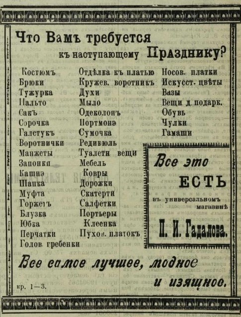 Жесткая конкуренция заставляла купцов активно рекламироваться. Улицы были заполнены вывесками, а газеты — объявлениями. Так, на страницах газет «Красноярец» и «Енисейская мысль» горожанам предлагали купить всё для праздника.