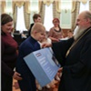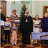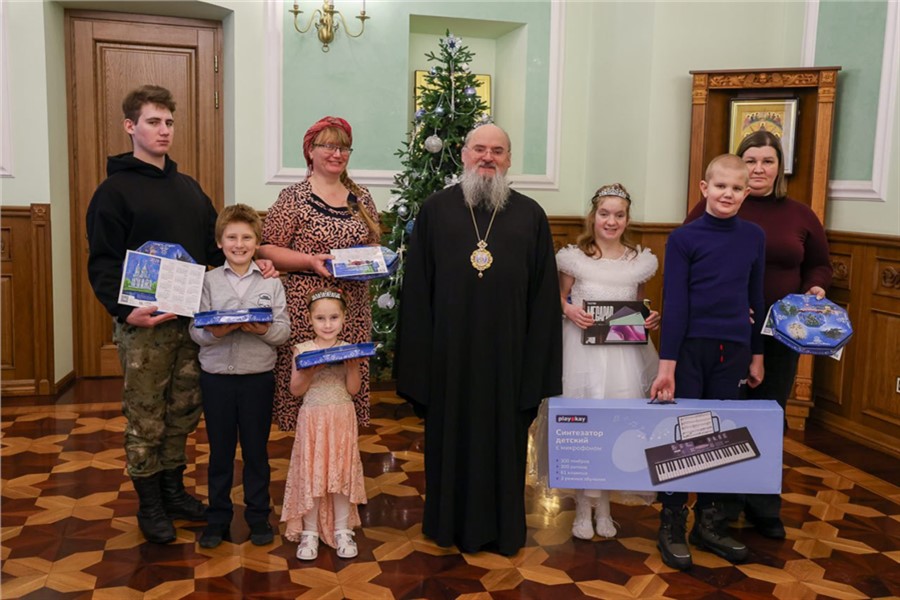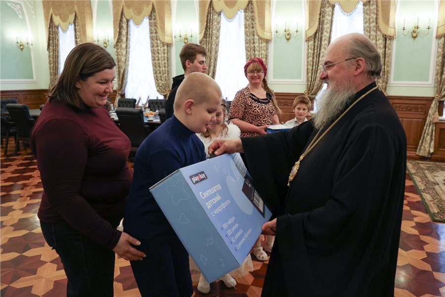 Правящий архиерей подарил юным красноярцам синтезатор и планшет, а их семьям — сладкие наборы.