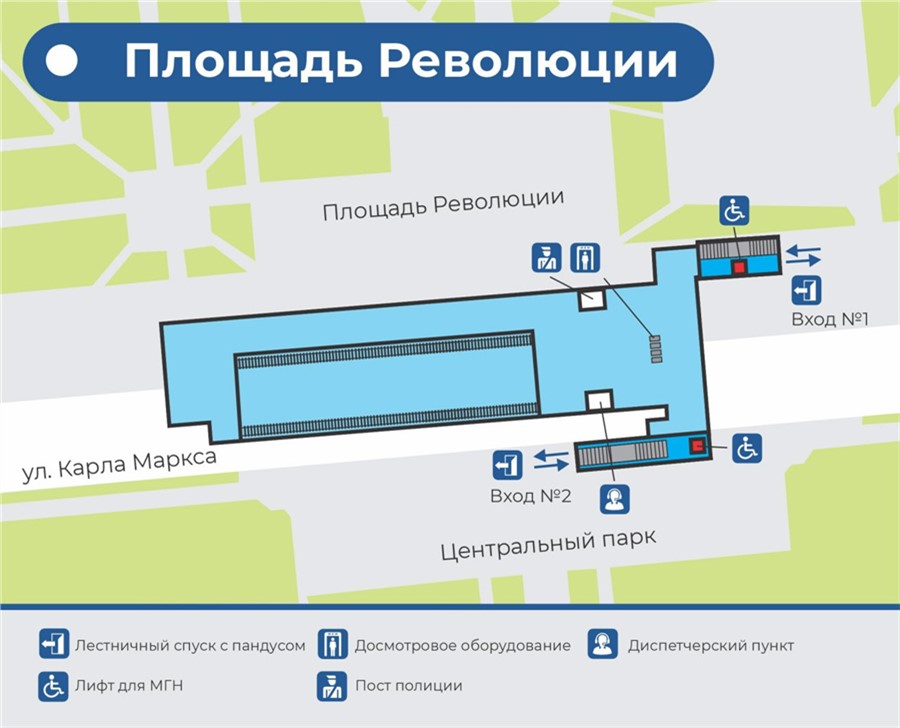 - «Площадь Революции» — с выходами на обе стороны улицы Карла Маркса к жилым домам, Центральному парку, площади Революции, зданию Правительства Красноярского края, набережной Енисея и другим точкам притяжения;