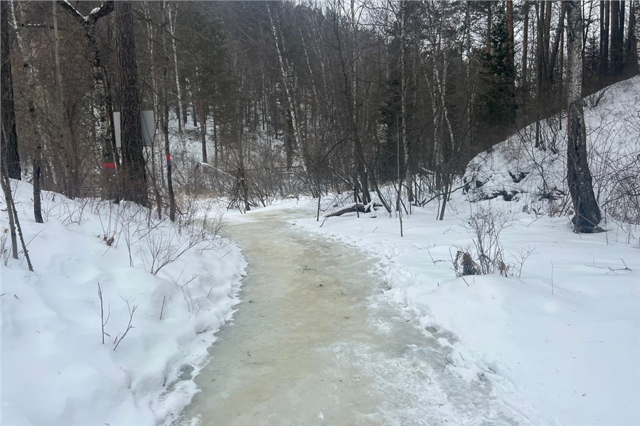 На территории «Красноярских Столбов» из-за постоянно меняющейся погоды и неустойчивой температуры воздуха образовалась гололедица.