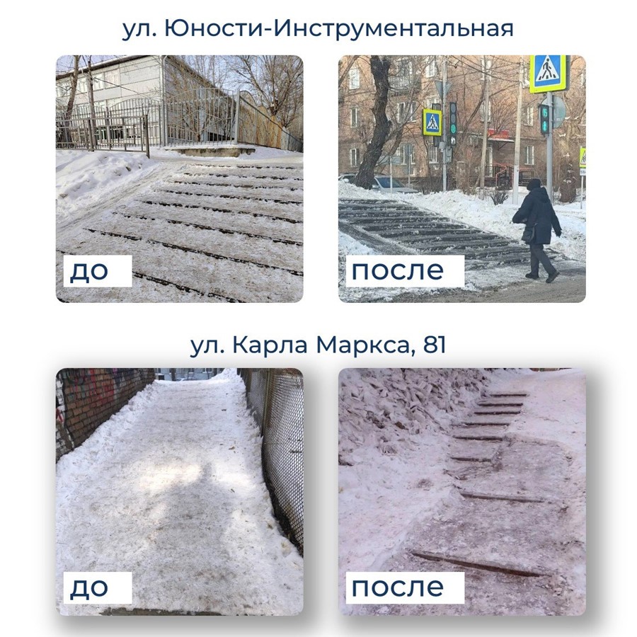 На днях почистили от снега пешеходные дорожки на набережной реки Бугач и убрали наледь со спусков по ул. Красномосковская. По сигналу Елены из Центрального района привели в порядок лестницы рядом с детским садом в районе ул. Карла Маркса, 21. В Ленинском районе почистили спуск рядом с гимназией № 11 по улице Юности-Инструментальной.