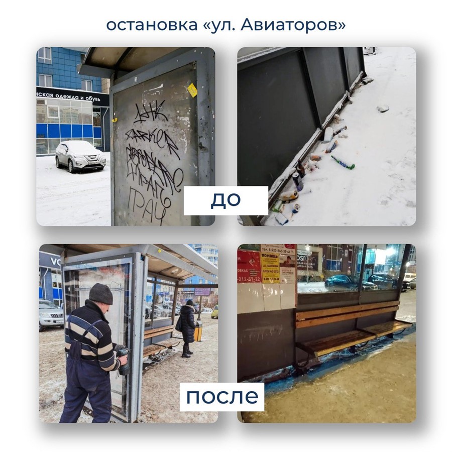 К примеру, горожанка Наталья рассказала о плохом состоянии автобусной остановки «ул. Авиаторов». Специалисты оперативно выехали на место и убрали мусор, очистили урны, стерли граффити.