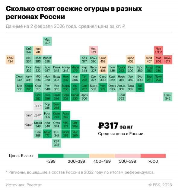 В Красноярском крае оказалась одна из самых высоких цен на огурцы. Инфографику по данным Росстата составили в РБК.