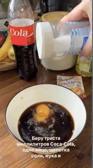 «Это сахарная бомба. В „Кока-коле“ примерно 6 ложек сахара на стакан. Добавляем муку — получаем глюкозный удар по поджелудочной. Даже просто так „Кола“ — напиток с нелегким для организма составом: сахар, ортофосфорная кислота, ароматизаторы. А при нагревании на сковороде эти компоненты вступают в реакцию с мукой и яйцами — последствия для организма от такого „набора“ не самые лучшие».