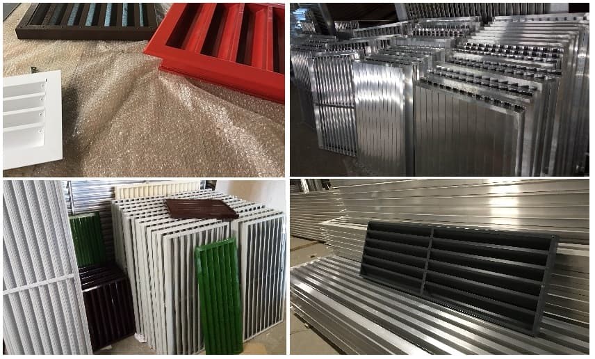 - Алюминий. Решетки из него легкие, не подвержены коррозии и хорошо выдерживают атмосферные воздействия. Кроме того, они могут окрашиваться порошковой краской в разные цвета, что позволяет подобрать решение под любой фасад.