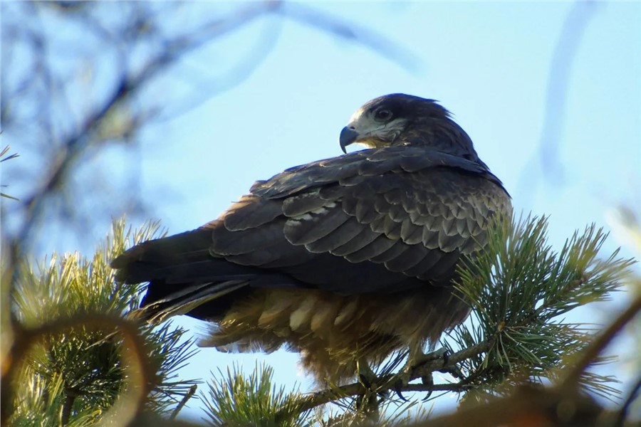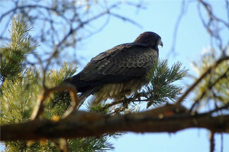 «Свирепый охотник при этом прищуривался, крутил головой в разные стороны и, цепко вцепившись когтями в высокую ветку сосны, покачивался на ней, словно на качелях», — отметили в ведомстве.