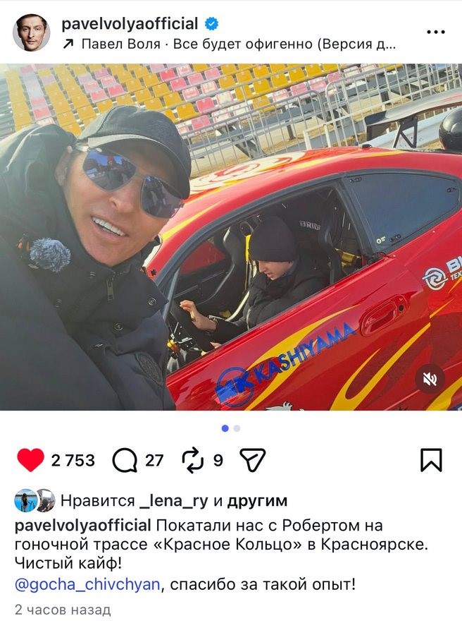 После этого Воля рассказал, что вместе с сыном Робертом катается на гоночной трассе «Красное кольцо». Заезд для них устроил красноярский дрифтер Гоча Чивчян. «Чистый кайф», — подписал ролик Павел Воля.