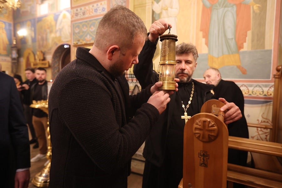 В 19:15 Огонь по традиции привезли в храм Рождества Христова на улице Щорса, 44 «а». Там его встречали многочисленные прихожане и клирики.