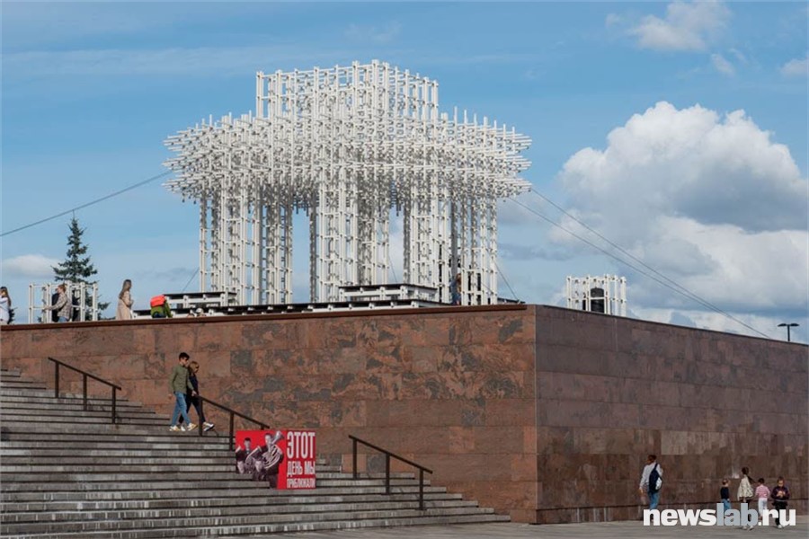 Яркая воздушная «Ротонда памяти и славы» около музея «Площадь мира» тоже посвящена Победе в Великой Отечественной войне — авторы назвали ее «рефлексией 75-летнего юбилея Победы».