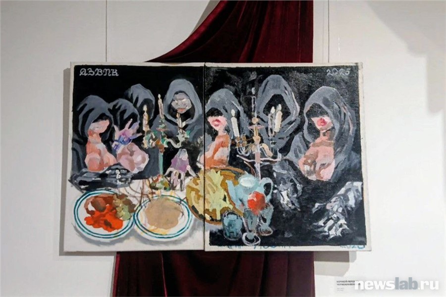 В центре зала — монументальный «Триумф доблестного рыцаря, укротителя узниц макромастии». Холст размером 1,5 на 1,5 метра подавляет размахом и формами этих самых узниц. Кажется, вот-вот и услышишь топот копыт, фанфары (или грустные напевы?) и что еще полагается для этой странной процессии. Замечаю, что лицо одной из узниц скрыто под шлемом — эта деталь не дает покоя, будто приглашая дописать историю самостоятельно. Причем решить — жуткая она или комическая, предстоит зрителю.