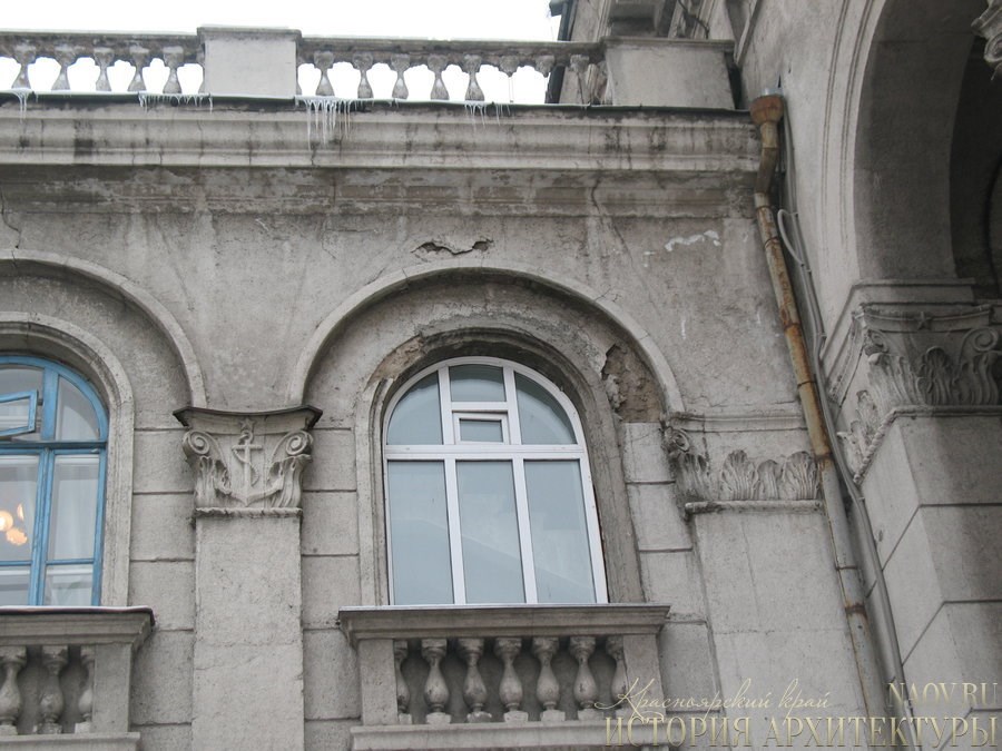 «Открываем массивные двойные дубовые двери, входим в вестибюль и словно оказываемся в одной из станций московского метро. Оригинальные колонны подпирают высокие своды, роспись которых выполняли лучшие художники города. При отделке некоторые краски разводились даже на яичном желтке. Люстры те же, что и в московском метро. Особенно поражал своим изяществом ресторан, расположенный в левом крыле здания. Небольшой, но очень уютный зал, стены бордового цвета, и на этом фоне — белоснежное кружево лепки вокруг оригинальных бра. Простая, но со вкусом подобранная мебель, массивный высокий буфет со стойкой. И никак нельзя обойти вниманием Адмиральский зал. На втором этаже он как бы соединял собой левое и правое крыло здания. Затенённый, какой-то таинственный, вокруг строго взирали со стен адмиралы, написанные маслом на холсте».