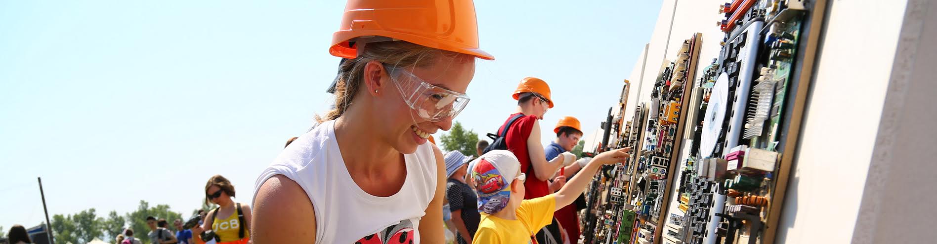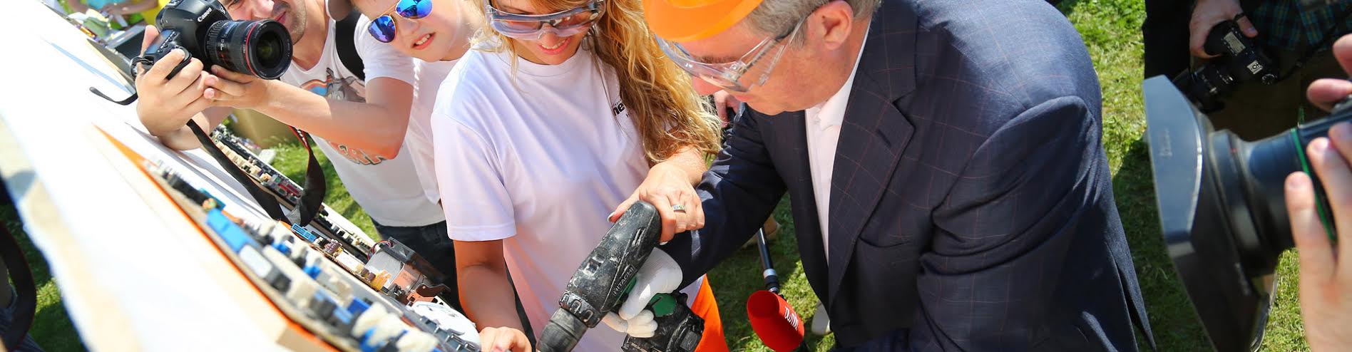 Поучаствовать в создании арт-объекта мог любой желающий. Каждый участник получил каску, защитные очки, шуруповерт и смог сам прикрутить старый гаджет к стенду — будущему арт-объекту. Рядом с местом «сборки» букв из старых клавиатур, неработающих телефонов, мониторов, плееров и прочего «электронного мусора» работала фотоплощадка. Участие в работе площадки приняли даже врио губернатора Красноярского края Виктор Толоконский и мэр Эдхам Акбулатов.