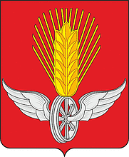 На геральдическом щите города Ужура изображены в червленом поле золотая головка колоса, поставленная на серебряное крылатое колесо.