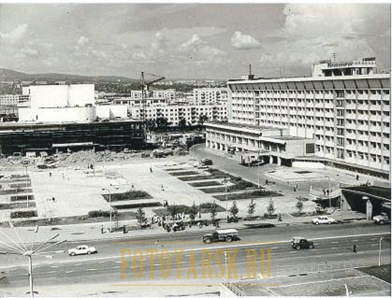 Великая стройка и злополучный ремонтНеобходимость строить на этом месте красивую площадь появилась после строительства Коммунального моста. На правом берегу тоже появилась площадь — Предмостная. Коммунальный мост через Енисей создавался с 1958 по 1961 год по проекту ленинградских архитекторов и на тот момент был самым длинным мостом в Азии (общая длина 2300 метров, ширина 23,4 метра, высота 26 метров).