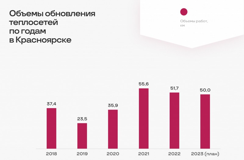 2023 год не является исключением, последние годы мы ведем работы с февраля по декабрь, в зависимости от погоды. Это вызвано тем, что с 2021 года идет полномасштабное обновление теплосетей Красноярска. До этого мы меняли по 20 км теплосетей в год, а сейчас — 50 км! Учитывая то, что объем увеличился вдвое, работаем почти круглый год. Только летних месяцев нам не хватит. Объясню почему.