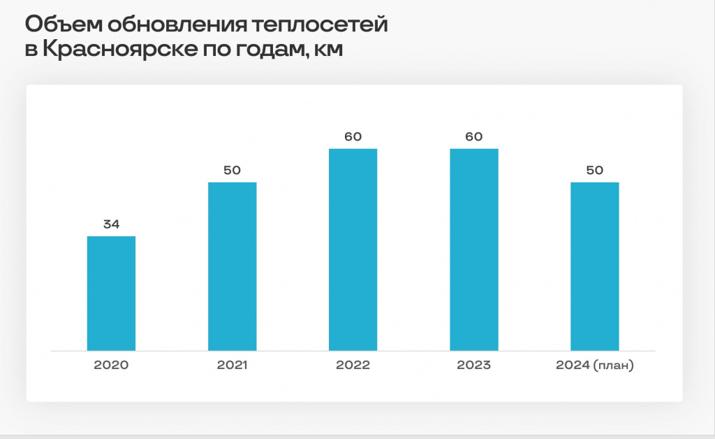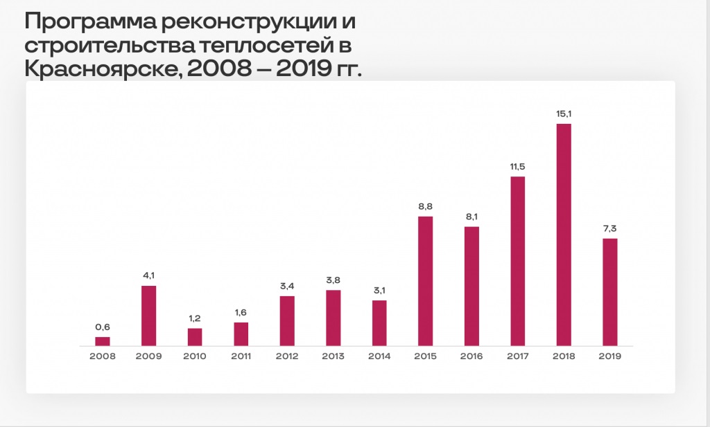 С 2008 до начала 2020 годов в городе построено и переложено с увеличением диаметра 74 км новых трубопроводов. Так, проложили трубопроводы в теле Николаевского и Октябрьского мостов, а также тепломагистраль на улице Авиаторов, расширили диаметр ещё нескольких, например, по ул. 60 лет Октября и ул. Дубровинского. Программа позволяла не только ежегодно обновлять городскую систему, но и создавать возможности для подключения новых объектов. С 2009 по 2019 годы в Красноярске такие разрешения получили более 1000 объектов.