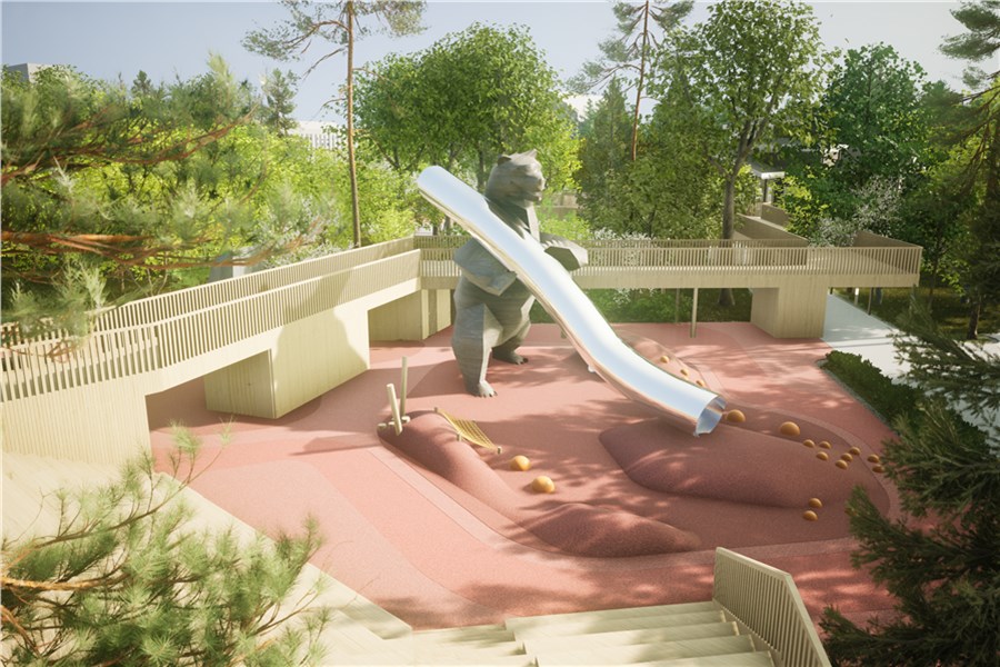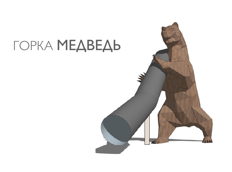 Акцентом новой площадки станет горка, выполненная в виде медведя. Высота горки будет около 5,5 метров, забраться на нее можно будет изнутри — для этого предусмотрены специальные лестницы и даже освещение. Сама фигура будет настолько большой, что в одной из ног уместится даже домик для малышей. Элементы, фигуры, игровые городки — все разработано и сделано по индивидуальному проектному решению.