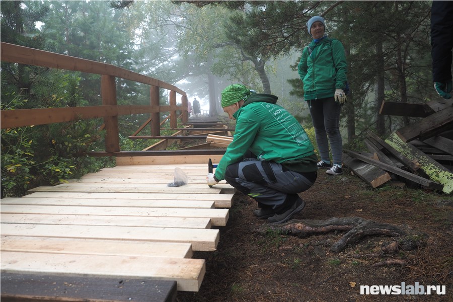 Как обычно, волонтеры распределились на группы. Кто-то занялся транспортировкой строительных материалов, кто-то ремонтировал настилы на тропах, кто-то оттирал надписи со скал.