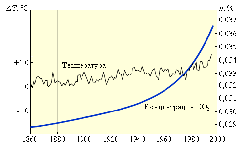 Динамика температуры и концентрации углекислого газа за последние 150 лет.