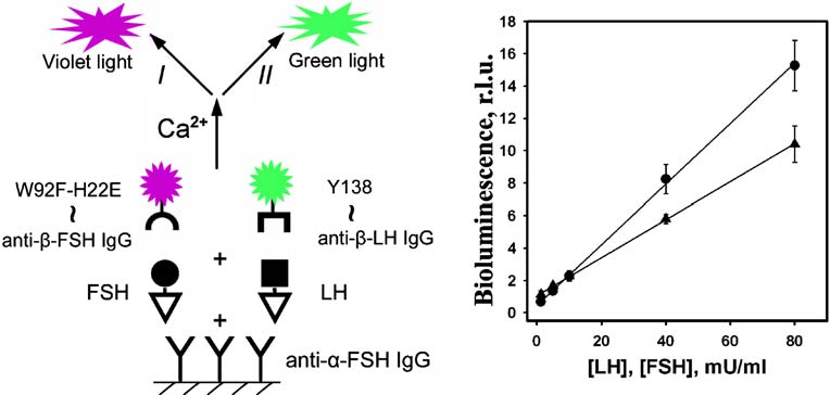 5. Здесь безусловный лидер исследования в области биолюминесценции. Я уже писал, про это направление в связи с получением в этом году нобелевской премии за близкие работы. Группа красноярских биофизиков в этом году опубликовала несколько статей в этой области. Здесь описание и новых светящихся белков и их структуры. Но работа года это, конечно, описание фиолетового и зеленого мутантов светящегося белка, и их использование для двухцветового иммуноанализа. Цветные мутанты получают направленным изменением структуры белка. В результате они святятся разным цветом. Далее эти мутанты специальным образом «соединяются», для того чтобы быть в одном растворе. А затем такой раствор можно использовать для одновременного анализа двух веществ. В работе приведен пример одновременного теста двух гормонов, регулирующих работу половых желез. Причем такой двухцветный анализ не уступает радиоактивному иммунному анализу, который выполняется для каждого гормона отдельно.