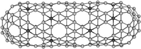 Баррелен (бочкообразная структура) из бора. Точками обозначены отдельные атомы.