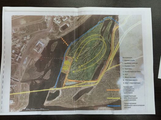 Судя по схеме строительства гольф-клуба на острове Татышев, на выделенном земельном участке планировалось построить огороженное от обычных красноярцев спортивное сооружение с КПП и переправой. Таким образом, разговоры о том, что будущий клуб будет доступен всем желающим, оказались, мягко говоря, не соответствующими действительности.