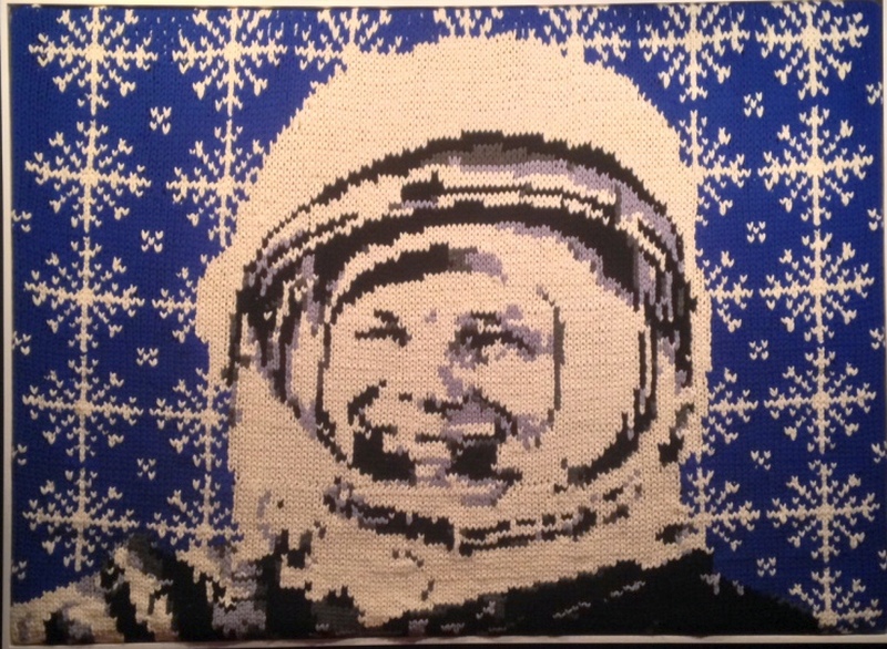 «Триипостасный свитер» Наташи Юдиной состоит из трех больших вязаных портретов — Путина, Гагарина и Деда Мороза (в центре будет Гагарин, хотя можно было подумать другое). Дело в том, что кураторов волнует внутренний космос, переходящий во внешний. Поэтому Гагарин, разделяющий (зрительно) этнографическую и современную экспозицию про кружева и переплетения — это почти волшебство. Работает всю ночь, бонусом — двухметровые спицы, которыми эти портреты были связаны.