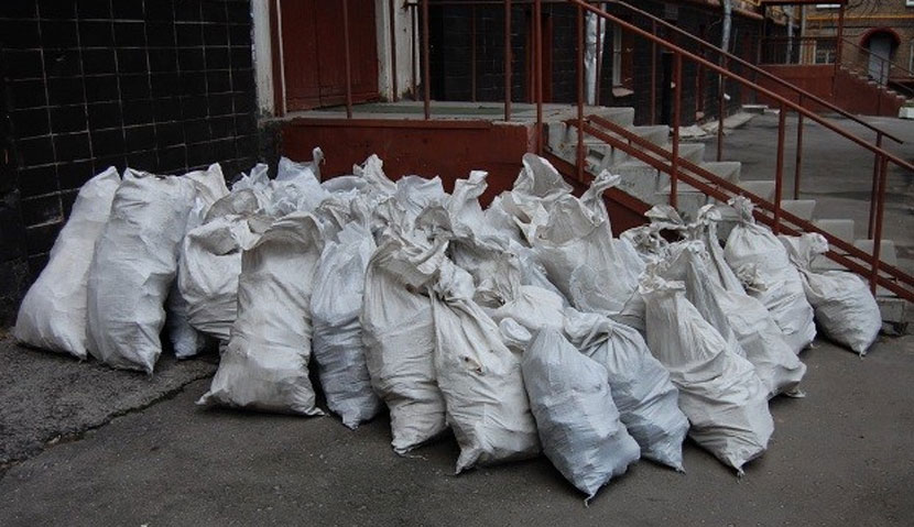 Но первый блин, как известно, комом. Приехали на хлебопекарню в районе Комбайностроительного завода, где на улице нас уже ждала гора мешков. Это была реально огромная куча, которая, как мы уже на месте поняли, точно не поместится в багажник девятки. Мешки мы все-таки купили, и начали трамбовать в машину — в багажник влезло примерно 400 мешков, на заднее сидение — 500 мешков, и еще 100 мешков Роман разместил у себя в ногах на переднем сидении.
