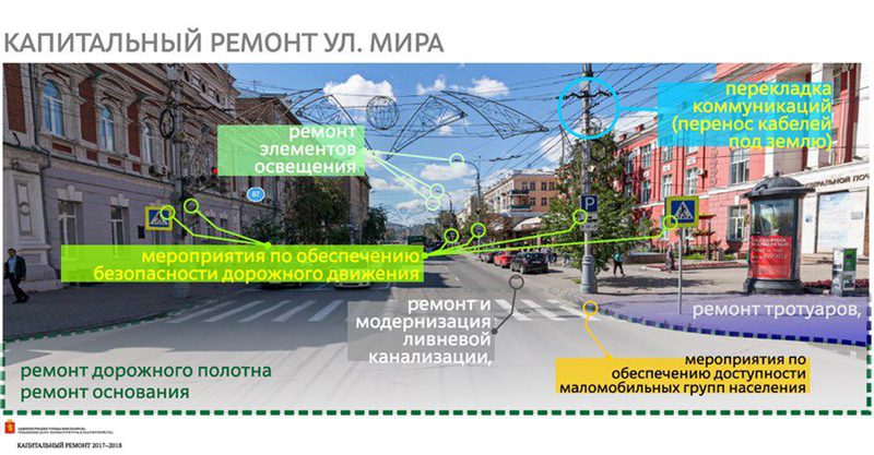 Серьезные перекрытия на капитальный ремонт ожидаются на улицах Карла Маркса, Ленина и проспекте Мира. Выделенные полосы, по словам мэра, будут проведены на ул. Партизана Железняка, ул. Копылова, проспекте Свободном и ряде других.