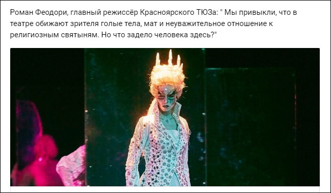 Совсем свежий скандал разгорелся вокруг сказки «Снежная королева», точнее — вокруг её одноименной постановки в ТЮЗе. На днях красноярец опубликовал в группе театра гневный отзыв на спектакль, обвинив постановщиков в оскорблении чувств неверующих: