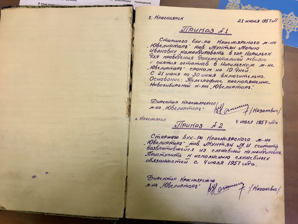 Магазином управляла Новосибирская межобластная контора «Ювелирторг». Оттуда поступали распоряжения, приказы и назначения. В Красноярске хранится часть управленческих документов с 1957 года. Согласно записям, в то время торговая точка все ещё находилась в деревянном строении на Мира, но спустя семь лет случились существенные перемены.