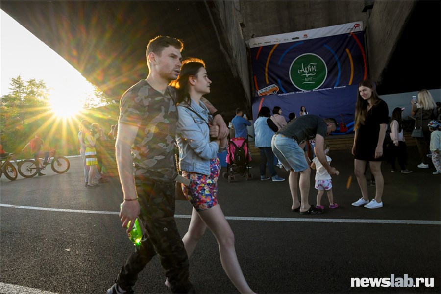 На пользу пошла и электрификация набережной — теперь у каждой площадки Арт-берега есть розетки. Впрочем, есть не только розетки, но и дальнейшие планы на жизнь — так, новопостроенная площадка, сразу за Коммунальным мостом, еще не оформлена, но сюда уже приходят люди — танцоры ставят колонку и танцуют, а у организаторов есть идеи пустить туда футбольных фристайлеров.