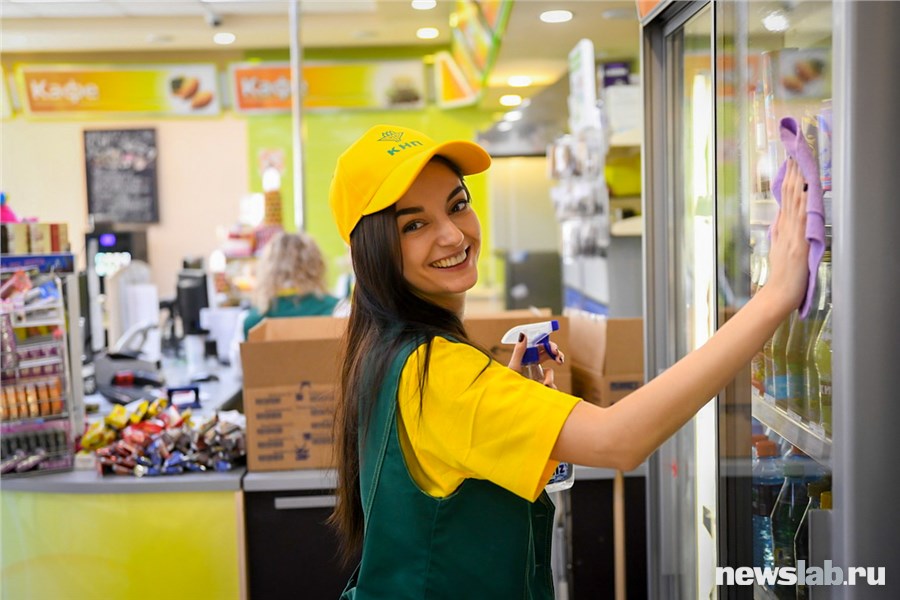Роль мерчендайзера, наивно надеюсь я, последняя на сегодня. Но тут мне протягивают спрей для мытья стёкол и тряпку.