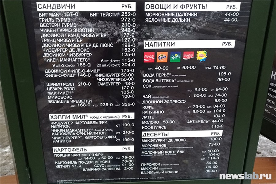 Согласно исследованию Яндекс.Денег, средний чек в «Макдоналдсе» по России — 278 рублей. Это чуть меньше, чем в KFC (302 рубля), но чуть больше, чем в Burger King (258 рублей). При этом средний чек в красноярском «быстром» общепите — 292 рубля.