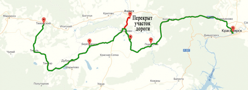 «Объезд данного участка необходимо осуществлять по автодороге Р-255 со стороны Мариинска через населенные пункты Тяжинский — Тисуль — Тамбара — Назарово. Со стороны Красноярска через Козульку — Подсосное —Сахапта — Назарово. Со стороны Ужура по автодороге Ачинск — Ужур — Троицкое, через Степной — Сахапта — Козулька. В сторону Мариинска — через Ужур — Шарыпово — Тяжинский», — пояснили в пресс-службе.