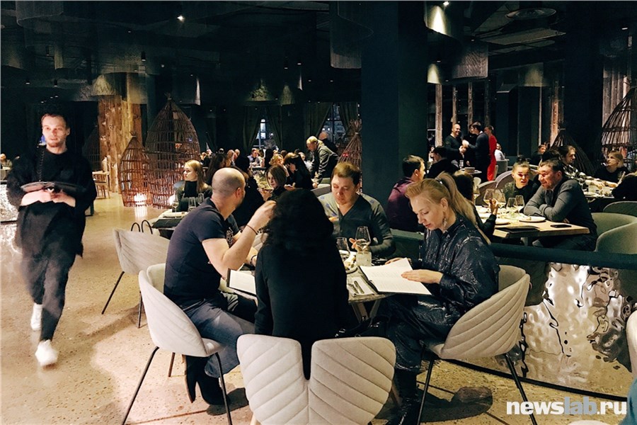 Гостей встречают развешанные по стенам звериные шкуры, огромный зал в полумраке, серебристые боковины изогнутых, словно русло реки, диванов, массивные столики и окна с видом на парк за тяжелыми шторами. Винная комната, пение шамана в уборной, стволы-колонны посреди зала, плетеные рыбацкие верши как светильники — куча всего, чтобы рассматривать и не скучать в ожидании заказа.
