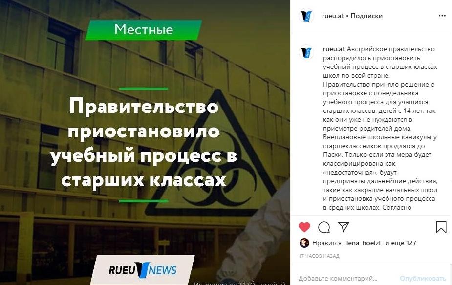С понедельника (16 марта) все кафе, бары, рестораны, театры, парикмахерские — закрыты. Работать будут только продовольственные магазины и аптеки. Курц в обращении честно сказал, что цель — замедлить распространение болезни. В этом плане австрийское правительство — большие молодцы. По сравнению с соседними странами ситуация в Австрии гораздо лучше, информации полно, люди хоть и не в восторге, но почти все запреты будут соблюдать. Пока в школах карантин до конца пасхальных каникул. Это 14 апреля. Дальше — неизвестность. Ситуация меняется быстро.