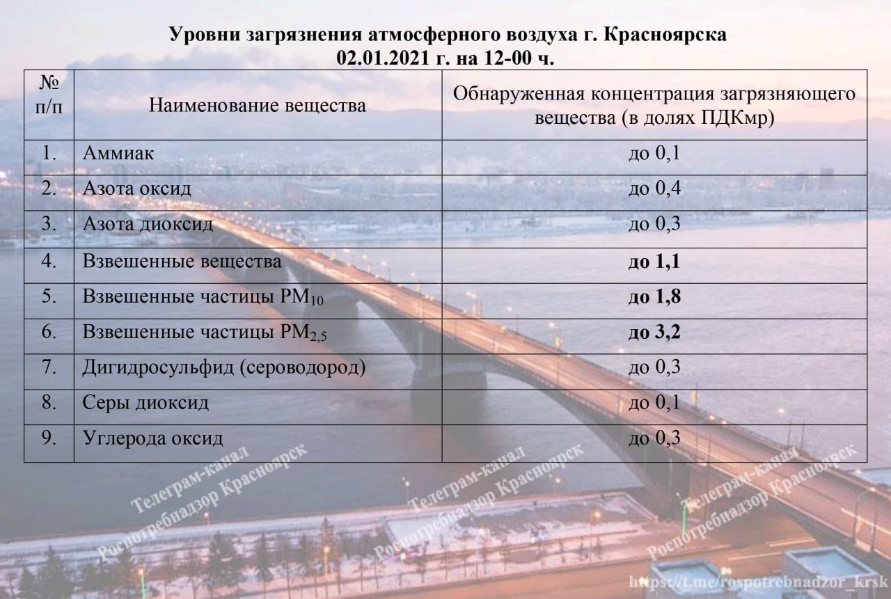 2 января в красноярском воздухе отмечено превышение концентраций взвешенных веществ и взвешенных частиц, сообщает пресс-служба Роспотребнадзора.